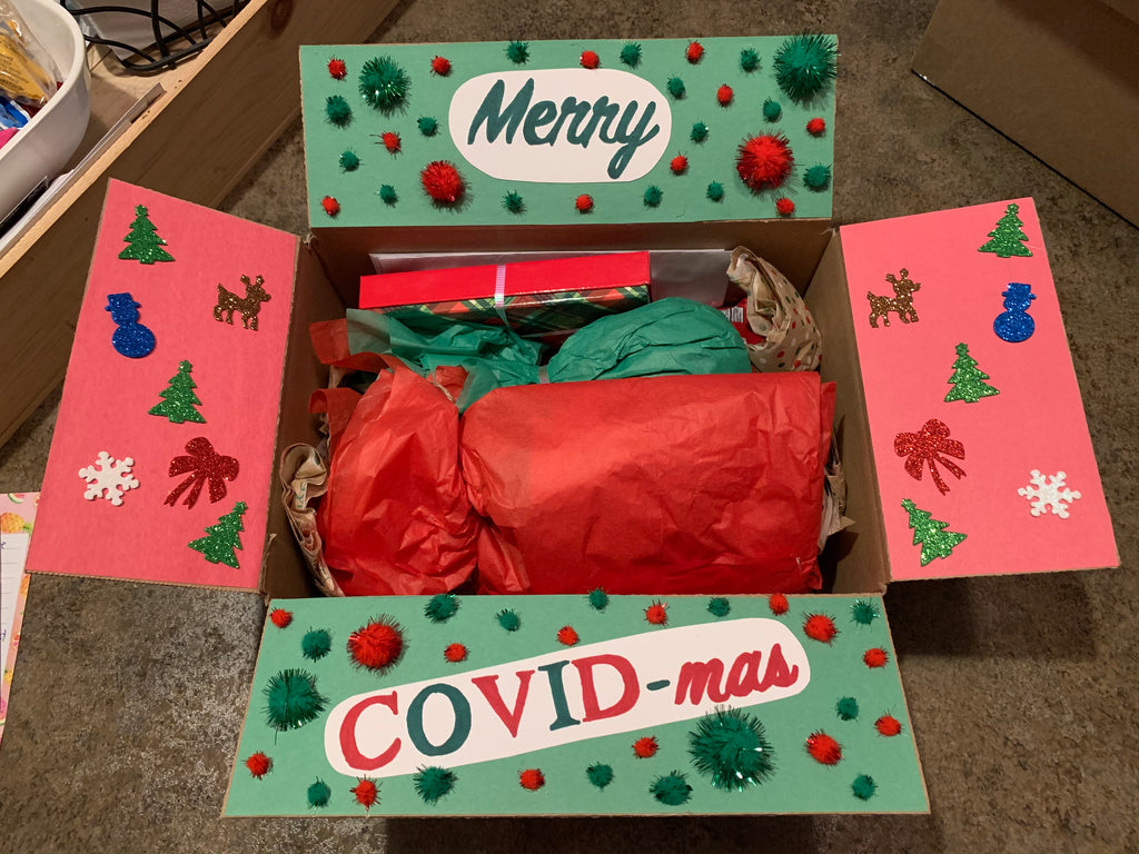 What better way to celebrate this unpredictable year than to add a touch of COVID to your gifts home. It's the whole reason you're stuck states away anyway, right? Same process as the previous box, but she did go ahead and use hot glue for the pom poms. These did make the box a little more difficult to close and the pom poms may end up arriving a little smushed up.