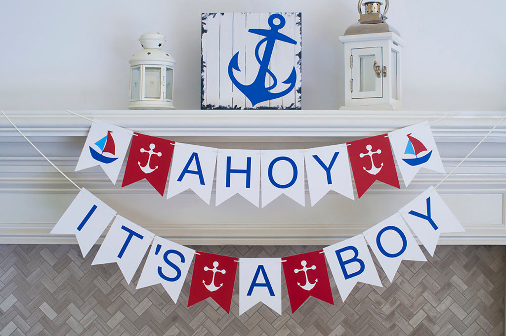 Ahoy Mom to be, announce your new baby with this stunning Ahoy It's A Boy banner for your Nautical Baby Shower. In vibrant red and blue with anchors and boats, made from heavy card stock will certainly have the sailors cheering.