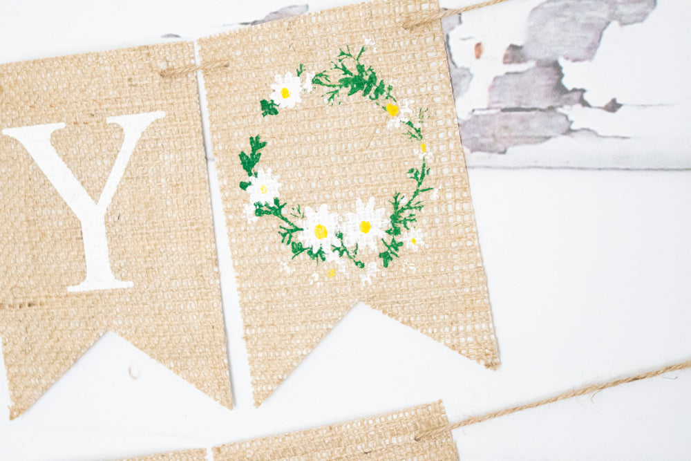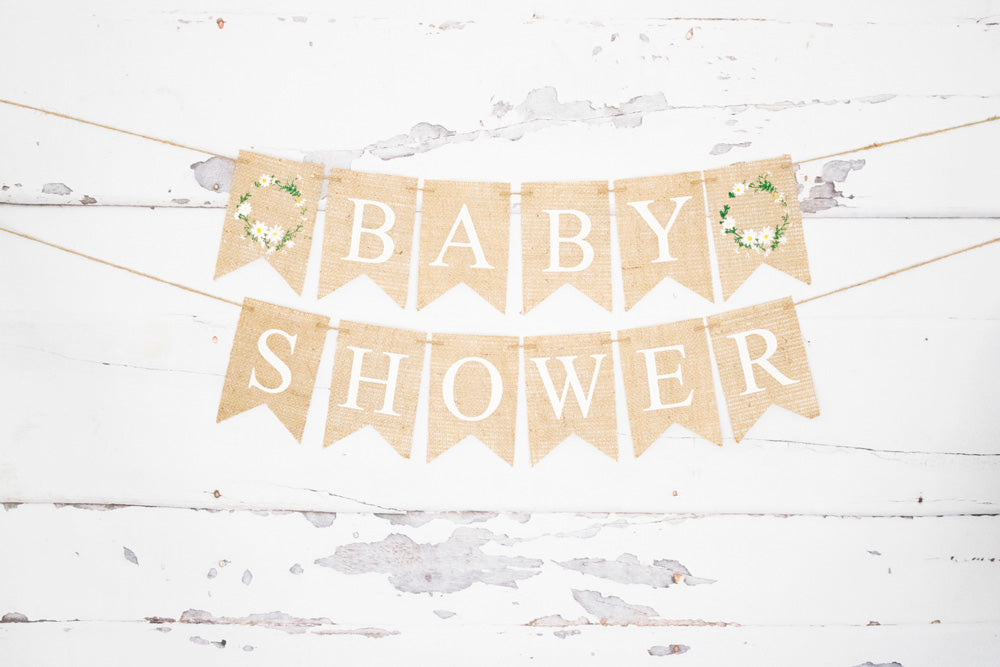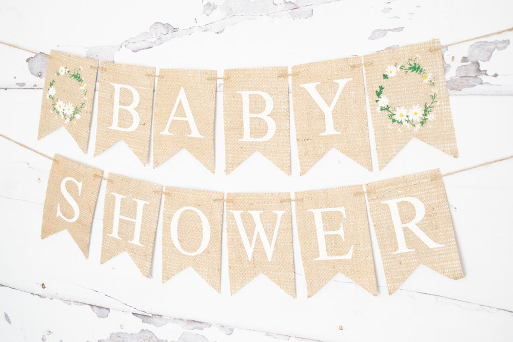 Burlap flags have white painted letters with the words Baby Shower and a delicate flowers wreath at the beginning and end of the word Baby. This baby shower decoration is perfect to announce a little one and celebrate the Mom to be.