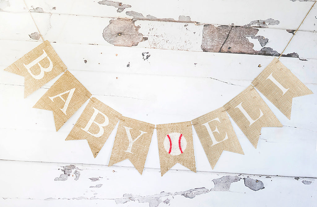 Baseball Baby Shower Decor. Great for a baseball themed baby shower banner. Hit a home run with this cute baseball baby banner! Personalize this banner with the name of your choice. Just use the drop down menu on the right to select the number of letters you will need for the name only.