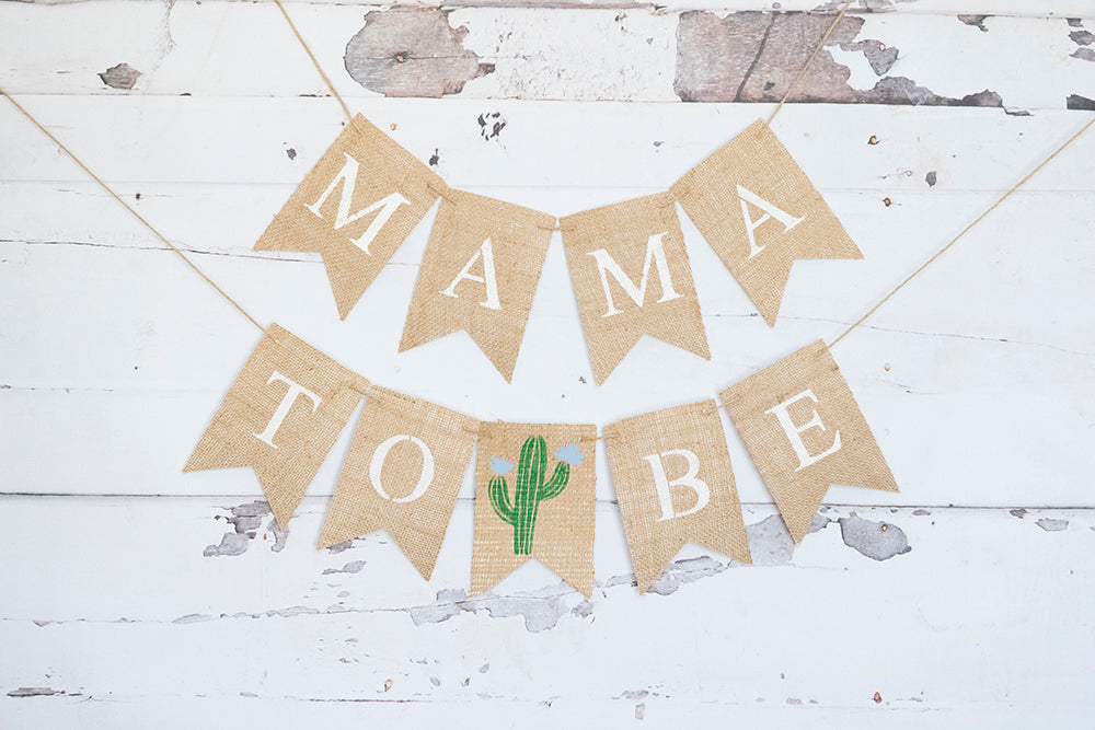Cactus baby shower banner. Fiesta pregnancy announcement. This cactus party decoration is ideal for that Fiesta Baby Shower. Hang on the Mama to Be's chair and get the party started. Flowering cactus is painted on burlap in green and baby blue and "mama to be" painted in white. Perfect for that summer fiesta shower.