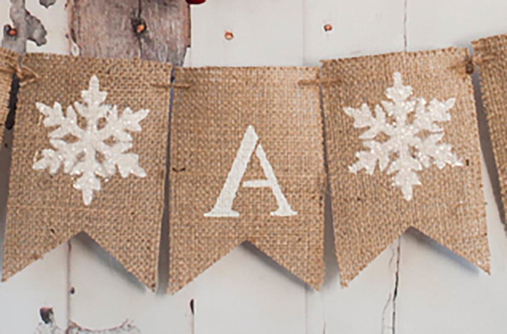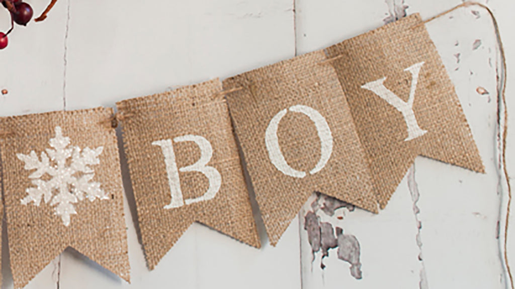 This It's a Boy Banner is made with burlap and the words are painted in white with white glittered snowflakes separating the words.