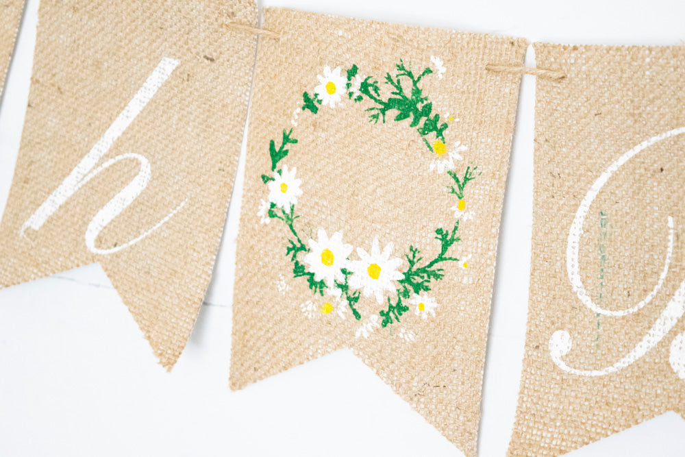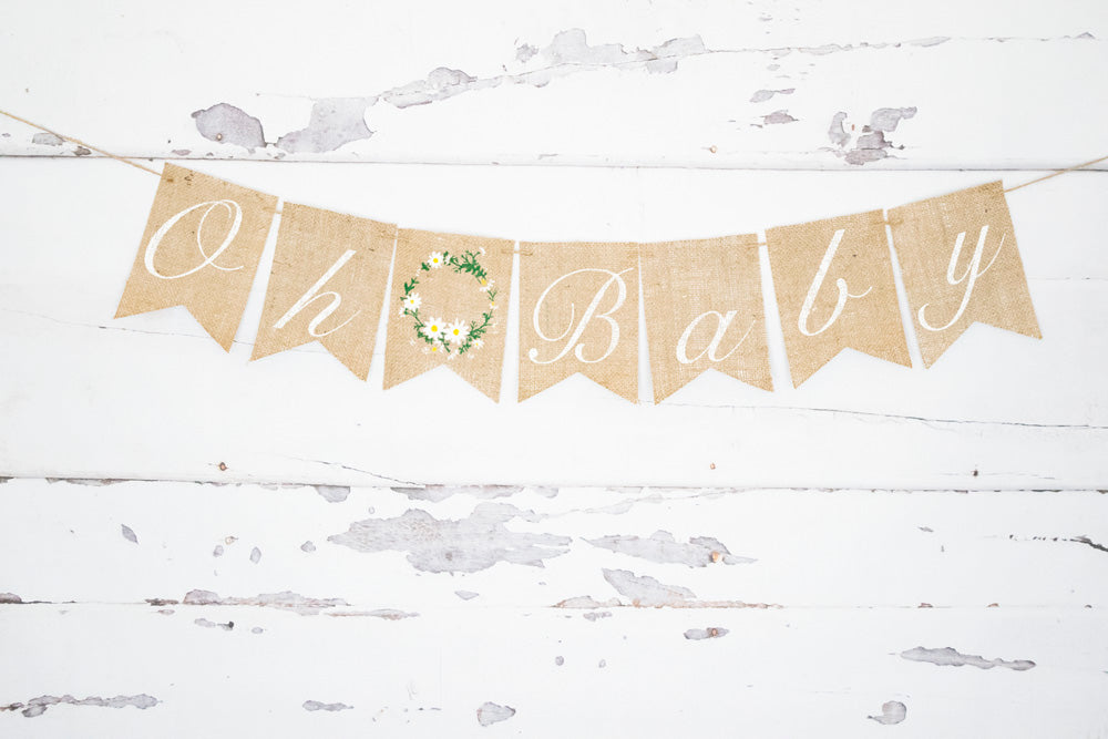 This floral Baby Shower banner with the words Oh Baby painted in white with feathers in between is great for a floral or rustic-themed shower and can also be used as nursery decor after the party.
