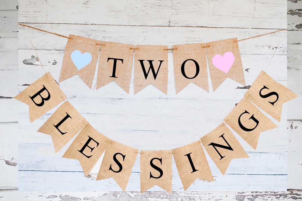Twins Baby Shower Decor. Welcome your twins in style with this gorgeous Two Blessings banner, the perfect twin baby shower banner, or hang in the nursery. Burlap flags are stenciled in black lettering with one baby pink heart and one baby blue heart. Congratulations on your two blessings.