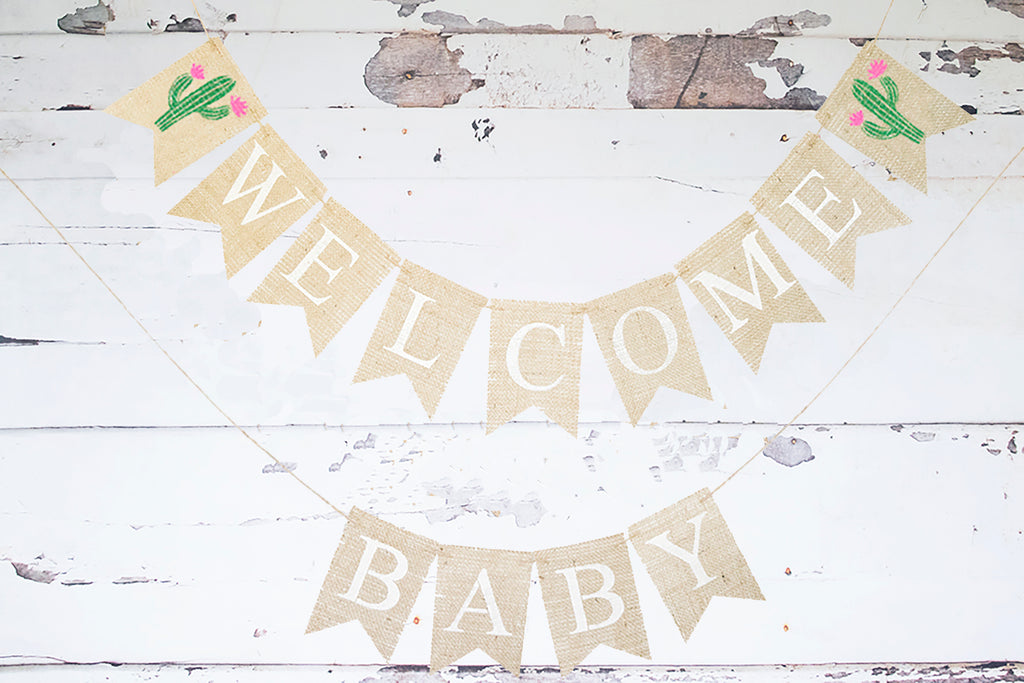 Cactus pregnancy announcement, Fiesta Baby Shower Banner. This welcome baby banner is perfect for your fiesta-themed baby shower. Beautiful green and pink cactus accent our bright white letters perfectly to make an adorable party banner.