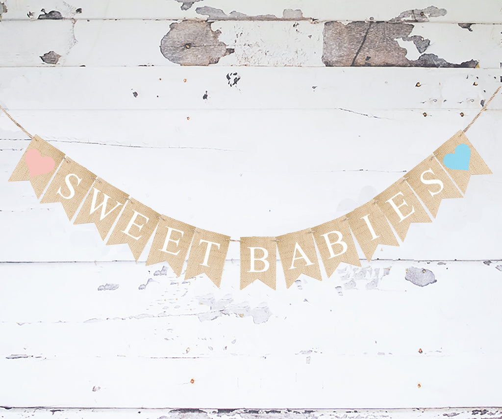 Baby shower decor, Gender reveal decorations. Twin Girl Baby Shower Decoration. Welcome your Sweet Babies at your Baby Shower with this gorgeous pink & blue heart baby shower banner. Hand-painted with the words Sweet Babies with one baby pink & one baby blue heart. Great for twin gender reveal or announcement.