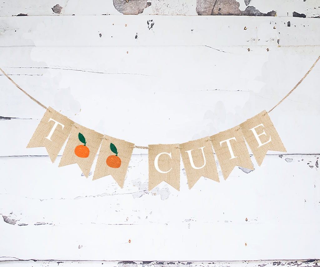This cute tangerine banner with the words "too cute" is perfect for a baby shower or baby sprinkle and can be used for a little cutie’s birthday party with a tangerine theme. Gorgeous in a bright white font with a vibrant tangerine painted in orange and green to separate the words.
