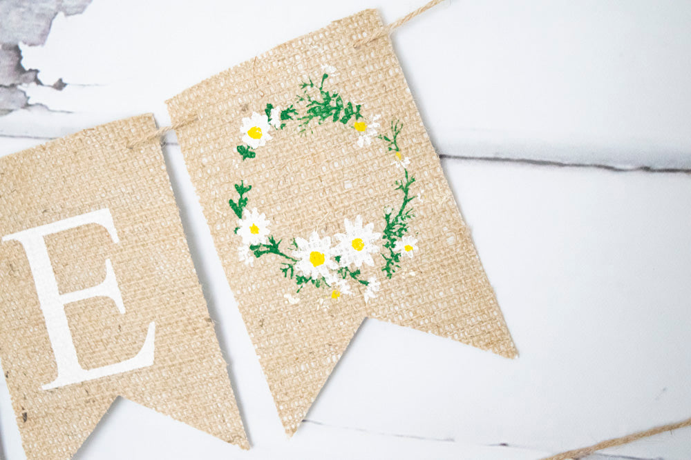 Celebrate your new family member with this gorgeous banner. Perfect for a baby shower or gender reveal party. Stenciled in bright white with delicate flower wreaths on each end.