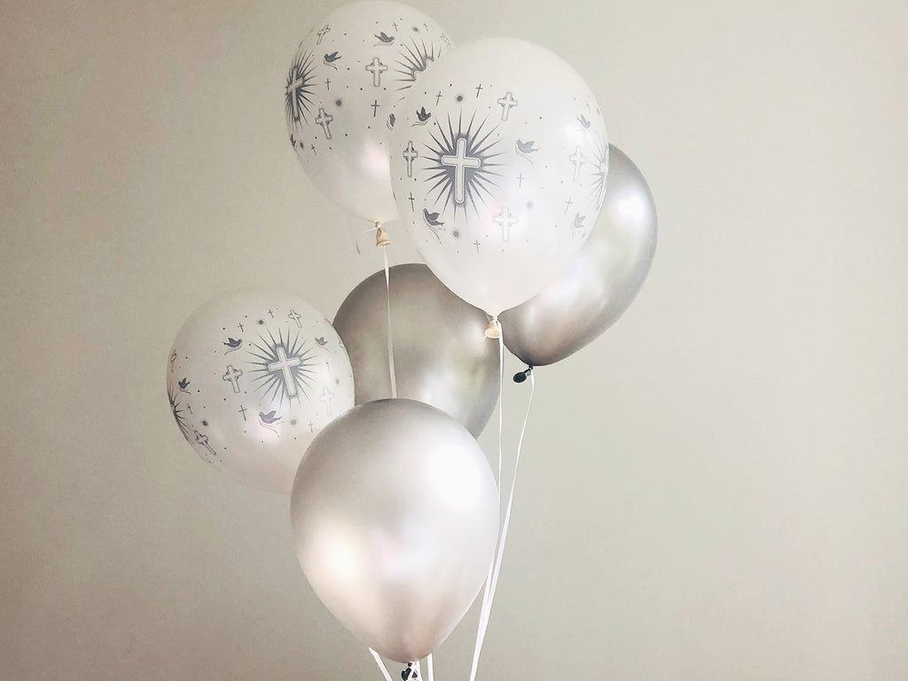 A Baptism, Christening or Communion decoration. These set of 6 balloons are perfect any religious event. Purchase several sets and add to the entrance of a Holy Communion reception. 3 balloons have silver crosses and doves and the remaining 3 are in a light metallic silver to compliment them. These cross balloons do not come with any ribbon. Fill with helium or air. Balloons measure 11 inches.