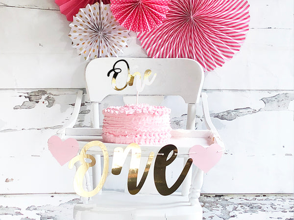Swanky Party Box 1st Birthday Pink and Gold Banner | First Birthday Decor | High Chair Banner with One Cake Topper from $6.50