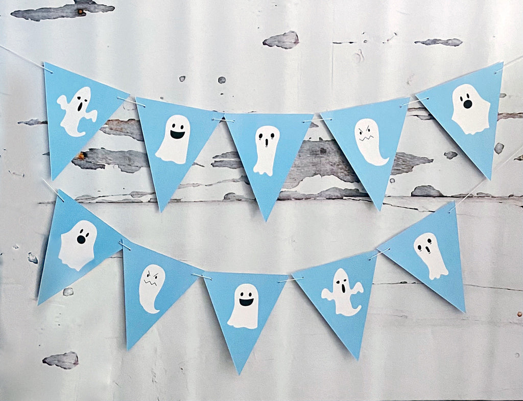 An adorable blue ghost patterned banner. Great for seasonal Halloween decorations or a Halloween birthday party. There are 10 flags per banner.