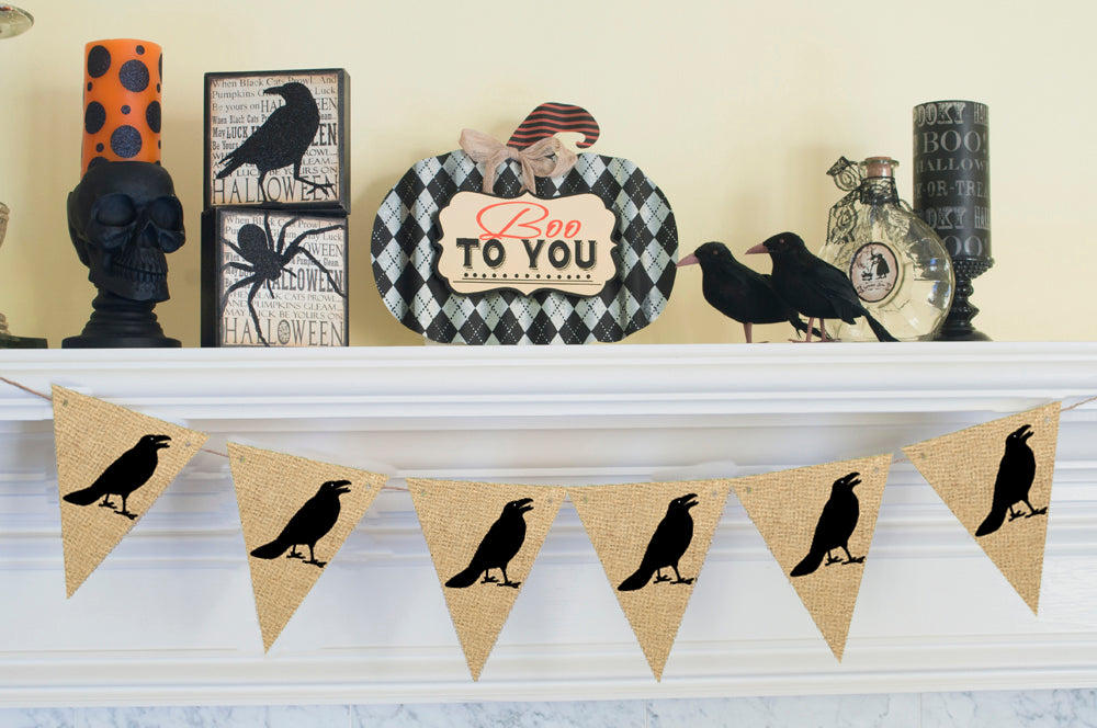 Halloween Decor. Have fun this Halloween with this Crow Banner. Black Crows are stenciled onto burlap to create a fun Halloween banner. Have a spooky Halloween.