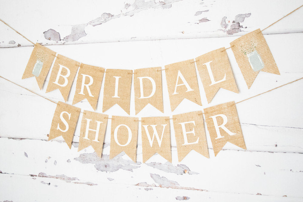 Mason jar bachelorette party decor. Decorate your bridal shower with a handcrafted, rustic burlap Bridal Shower banner. Perfect for any season, your shower decor will be stunning with this elegant decor.