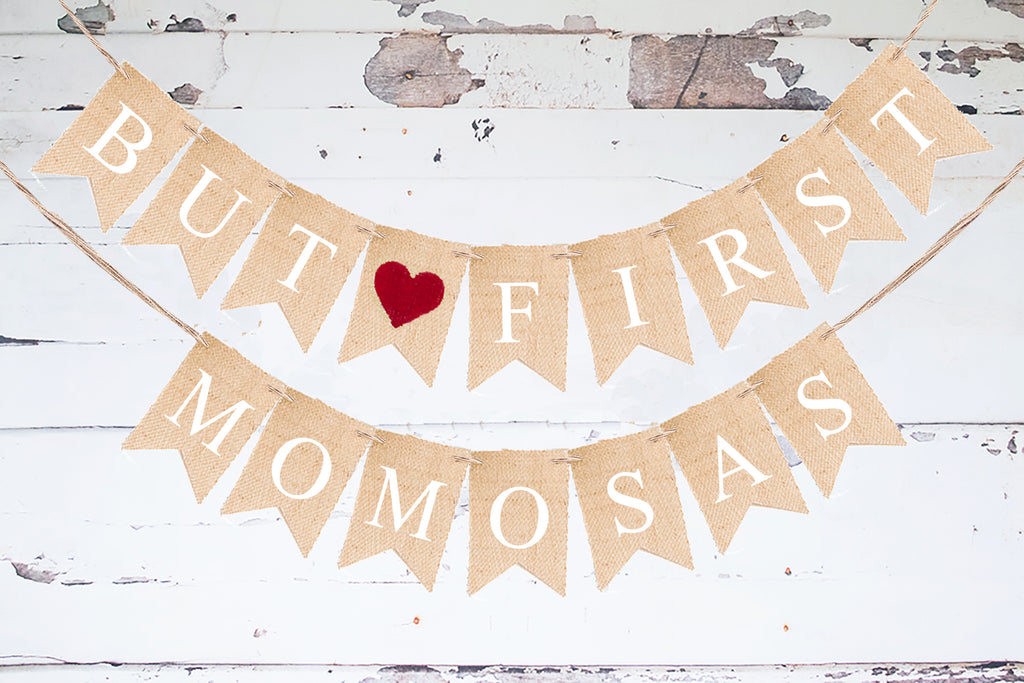 Mothers Day Decor. The perfect momosa banner for a Mothers Day brunch! Add a little extra decoration to your mother's day brunch to match your mimosa bar. Bright white lettering with red hearts stenciled on burlap. Perfect to take a photo on Mother's day or to hang over your lunch table.