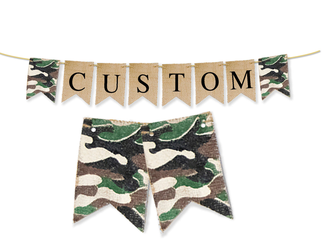 Custom Army birthday decoration, Military party banner. Perfect for a soldier or military-themed event. This army party decoration is prepared on burlap with black lettering in the custom wording of your choice.