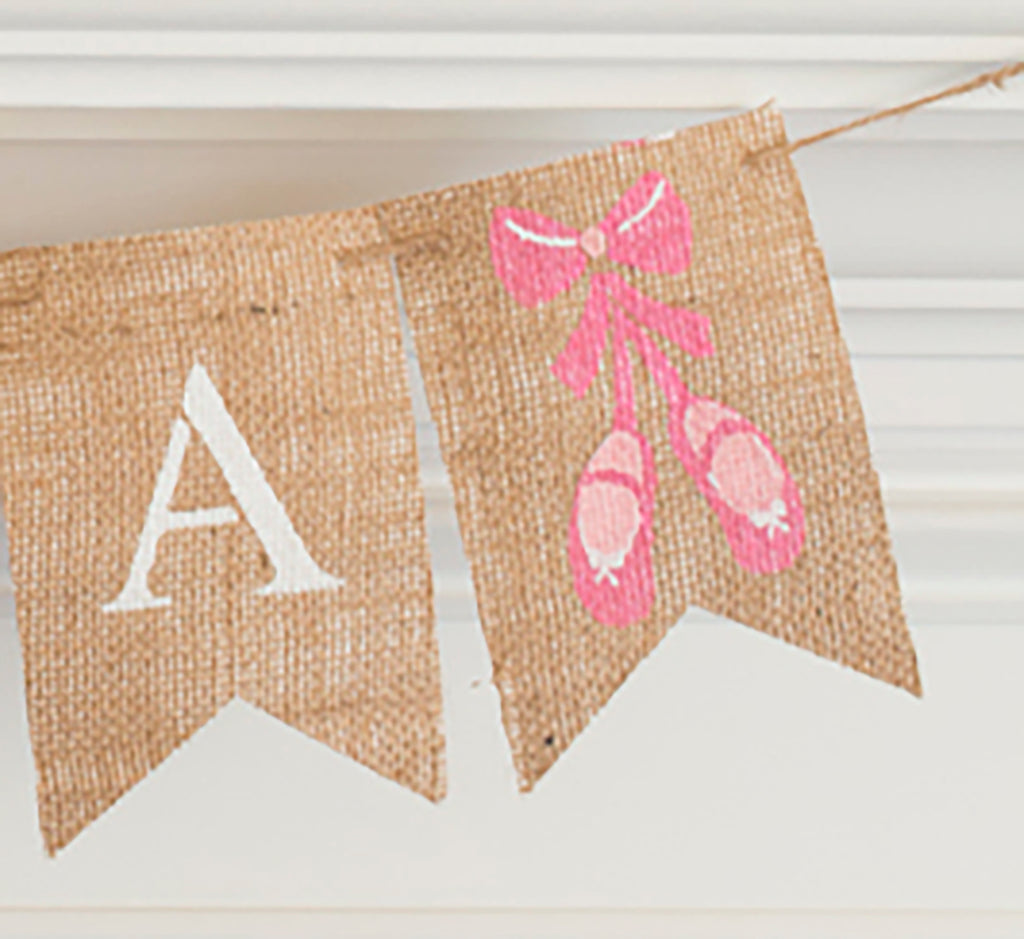 Create a ballerina party theme with ballet party decor like this burlap ballerina banner, personalized with your custom wording and featuring ballet slippers on each end that are hanging from a bow.