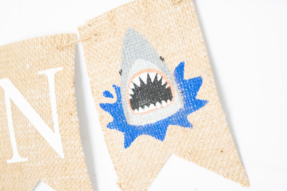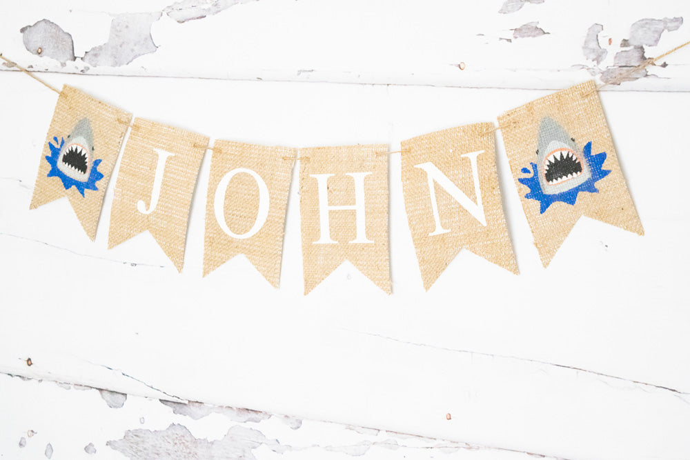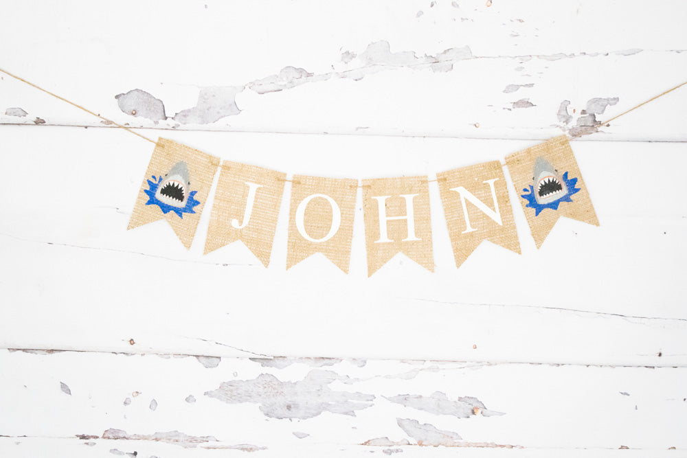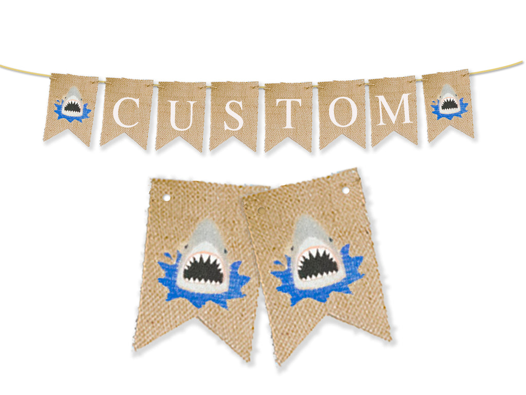 Personalized Shark Banner. A terrifying hand-stenciled shark burlap banner with bright white lettering of the custom wording of your choice. Hang this in a bedroom, on a door, or at your next party for guaranteed frights!