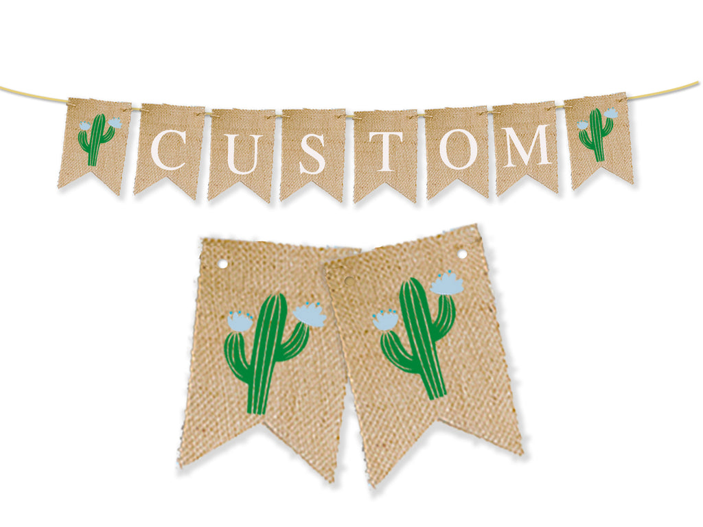 Fiesta party decorations. A fiesta-themed party decoration, perfect for a Cactus Party or Baby Shower. The flowering cactus is painted in green and blue. Personalize this banner with the custom wording of your choice. Just use the drop-down menu on the right to select the number of letters you will need for the customization only.