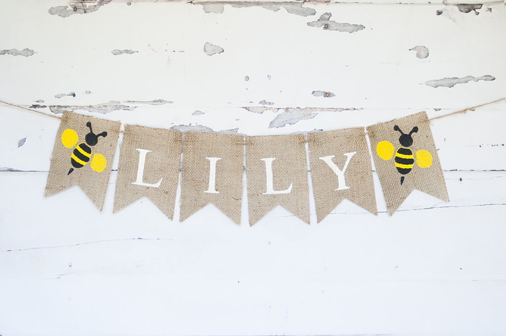 Bumble Bee Party Decor. Perfect for the Mommy to Bee Baby Shower or a Bumble Bee birthday party. A vibrant yellow and black bumble bee is at the beginning and end of this banner.