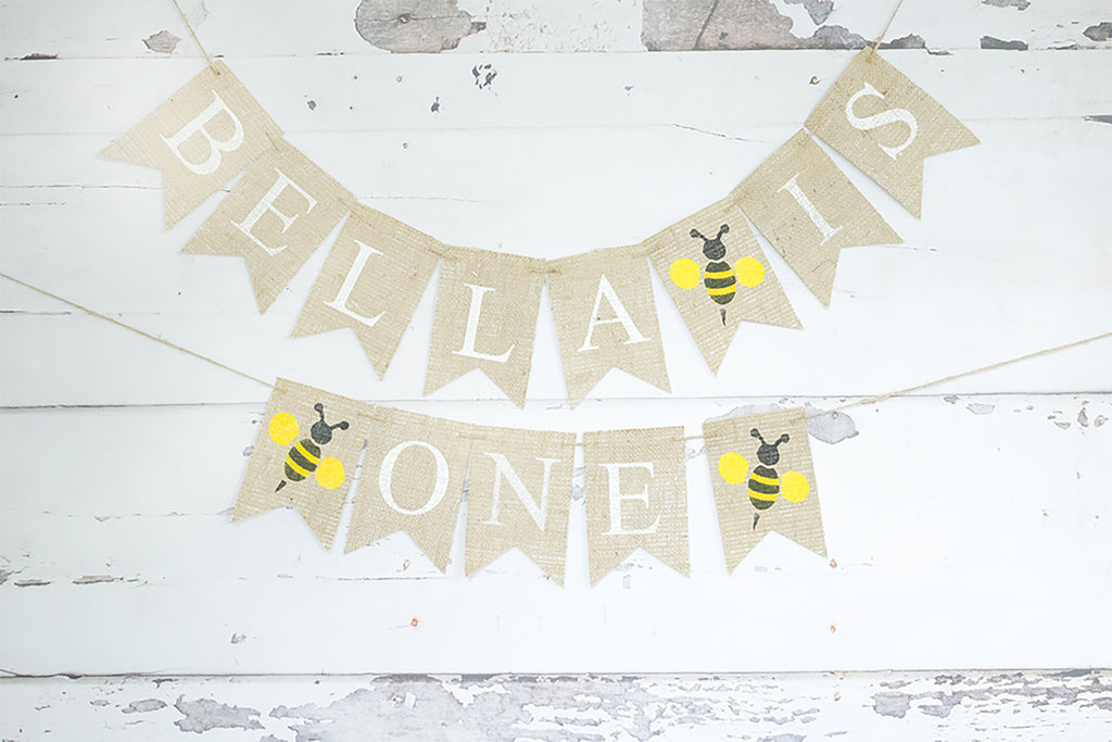 Bumble Bee First Birthday Party Decor, Bumble Bee Decoration. A beautiful bumblebee 1st birthday party banner, made from premium burlap with 3 vibrant bees painted in yellow and black. Personalize this gorgeous bumblebee-themed birthday garland with the name of your little bee. Just add the name in the notes at checkout. Count the number of letters of the name only and select the quantity from the drop-down menu on the right.