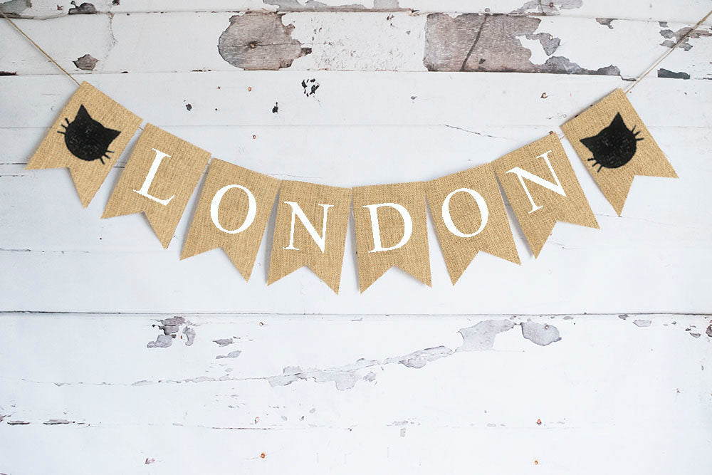 Cat name decoration. A cat-themed decoration, perfect for your kitty or cat-themed party. Two black cat heads are paired with bright white wording in the custom wording of your choice. Great as a pet-themed birthday decoration!