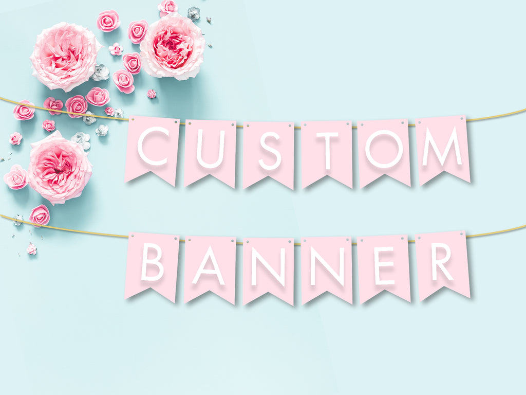 Design your own banner, you provide us with your own wording and we will print and ship it. Printed on heavy white card stock with a white font on a baby pink background.