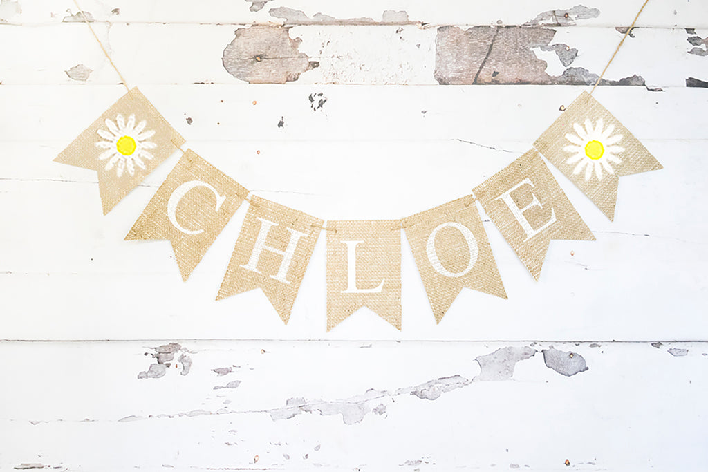 Custom Floral Daisy Banner. This is an absolutely gorgeous daisy banner, perfect for your birthday party, baby shower, or nursery decor- the uses are endless! Letters are painted in white capitals with white and yellow daisies on each end.