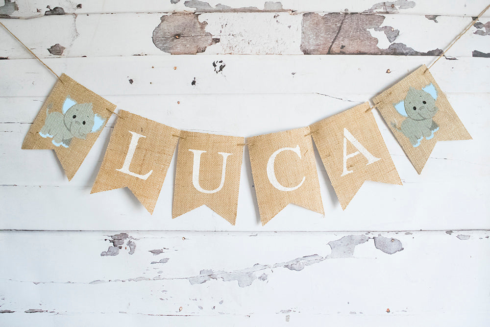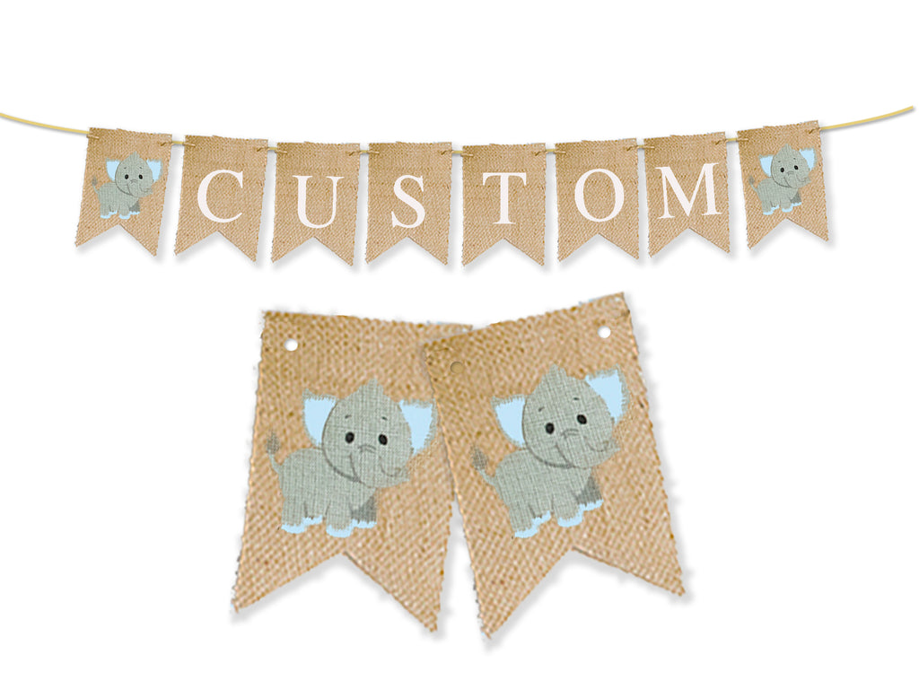 Perfect for your elephant-themed Baby Shower decor or elephant nursery decoration. Add your custom wording to the banner. The wording is hand-painted in white with grey and blue elephants on each side. Perfect for a little boy's baby shower.