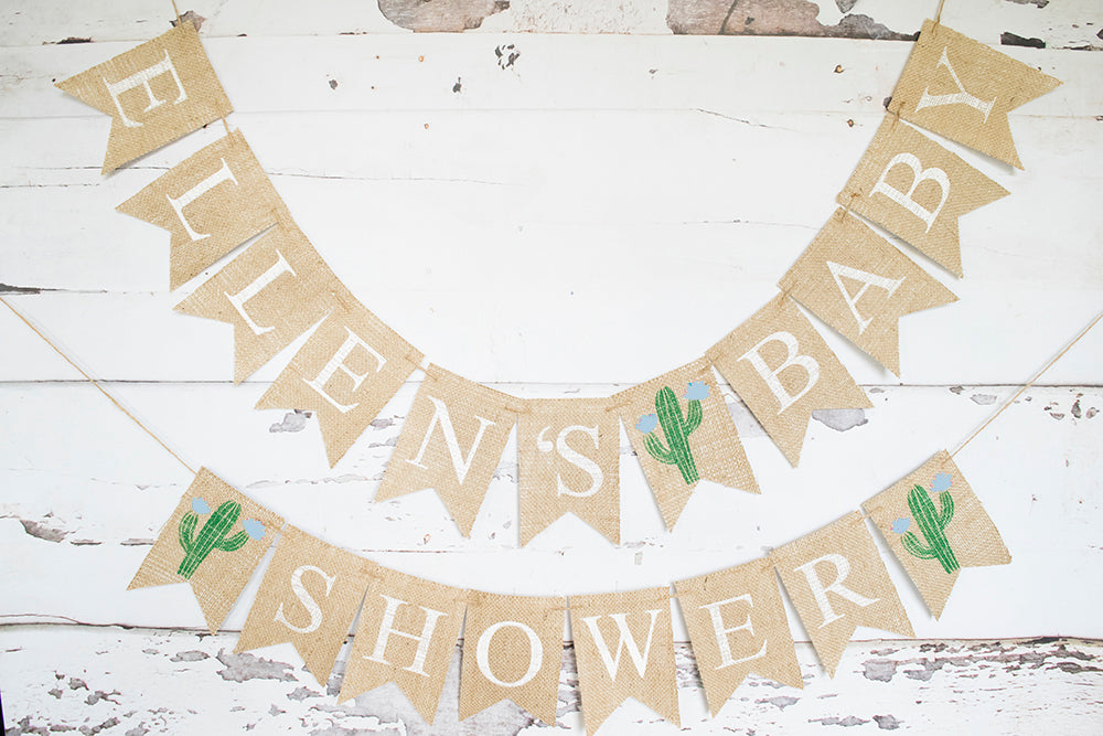 Fiesta Baby Shower Decoration. This fun cactus baby shower banner can be personalized with the guest of honor's name. Perfect for a Mexican-themed party, this festive banner with blue flowering cactus is stunning. just include the name on the notes to the seller when checking out. Count out the letter of the name only and use the drop-down menu on the right to select the quantity.