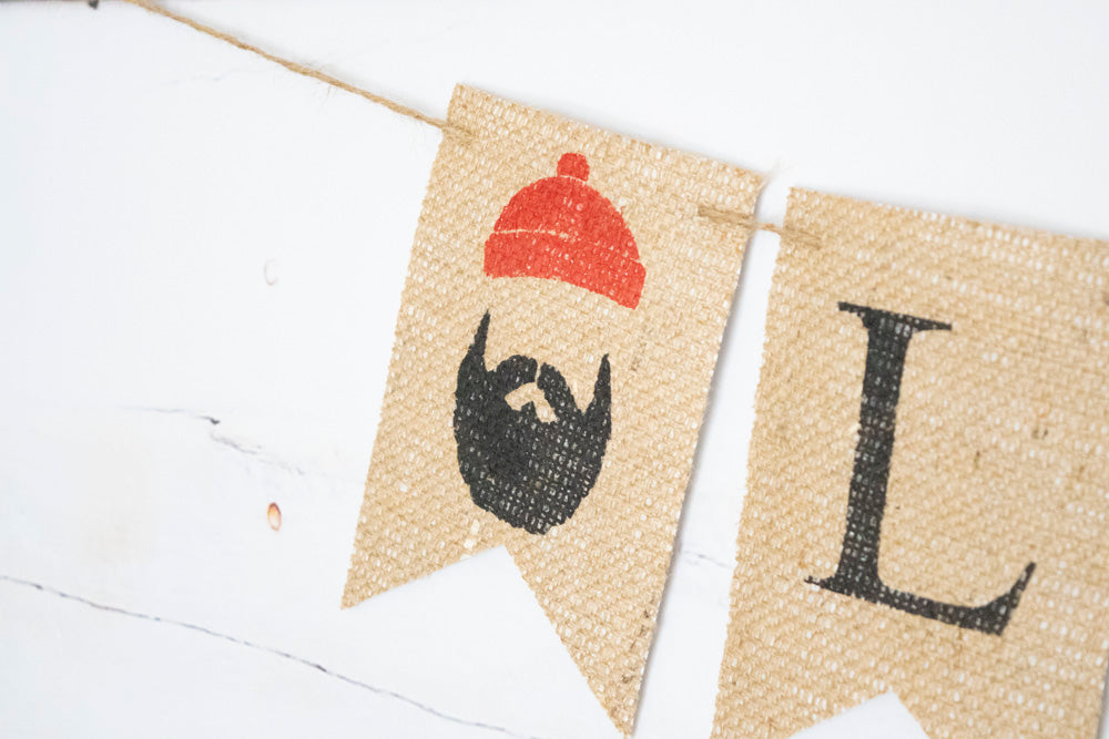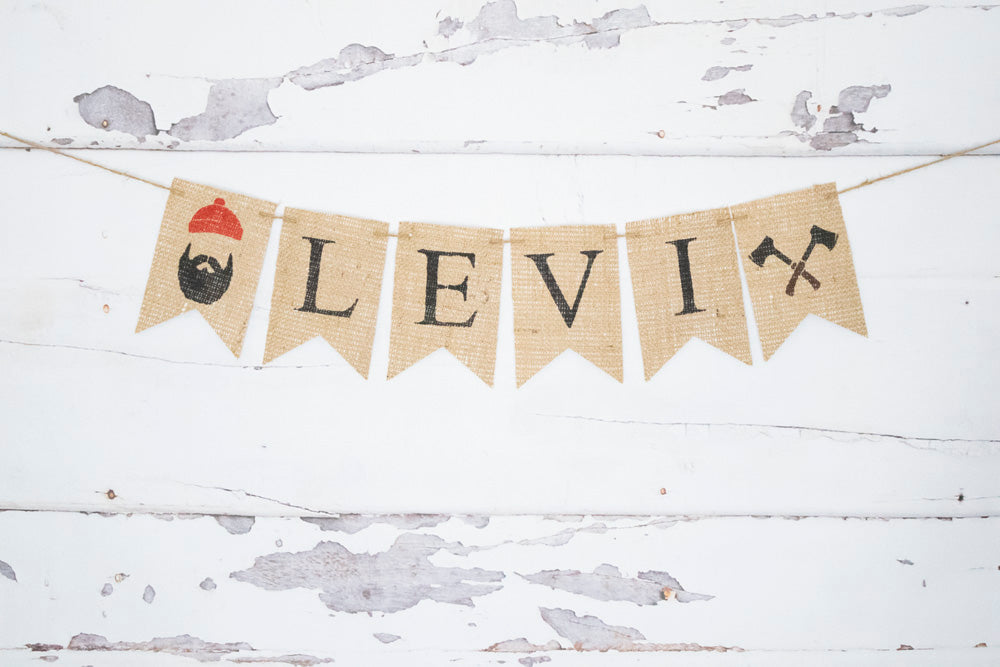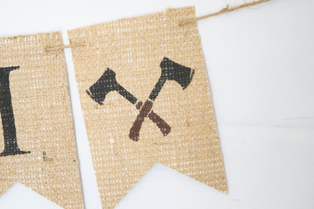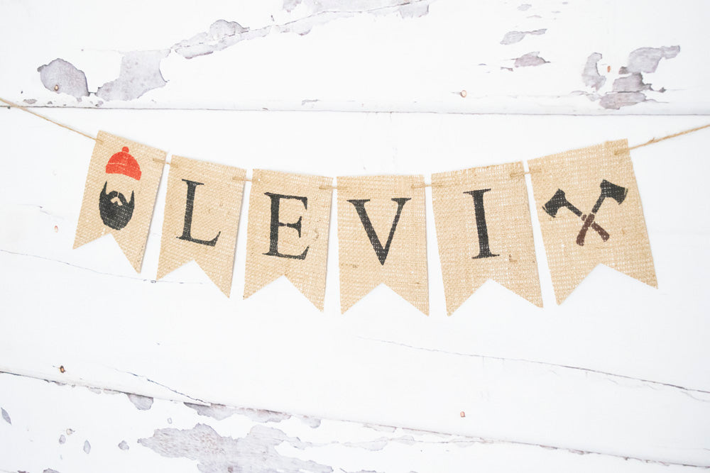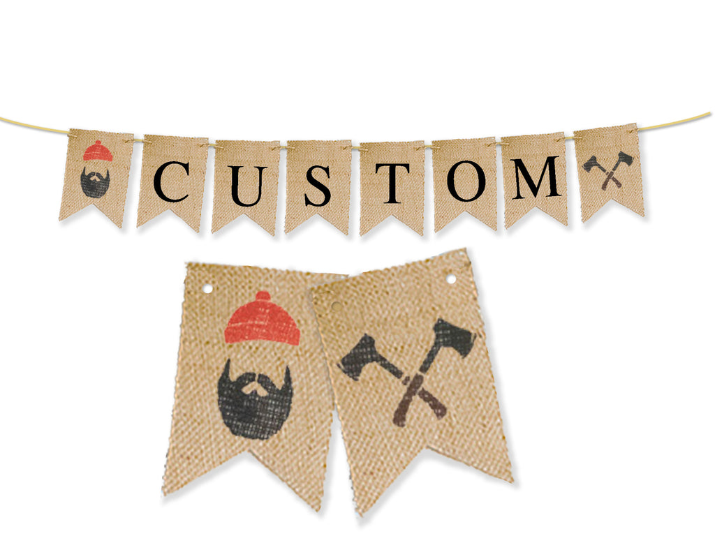Lumberjack Party Decoration. A lumberjack-themed party decoration, perfect for a Birthday Party. An ax and a bearded beanie wearing guy are painted on burlap for that rustic look.