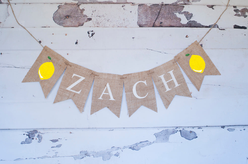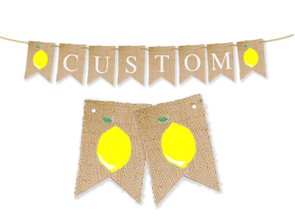 Lemon-themed birthday decoration, perfect for a 1st Birthday Party or a summer lemonade party. Burlap is painted with lemons on each end with your custom wording in the middle. Personalize this banner with the custom wording of your choice. Just use the drop-down menu on the right to select the number of letters you will need for the name only.