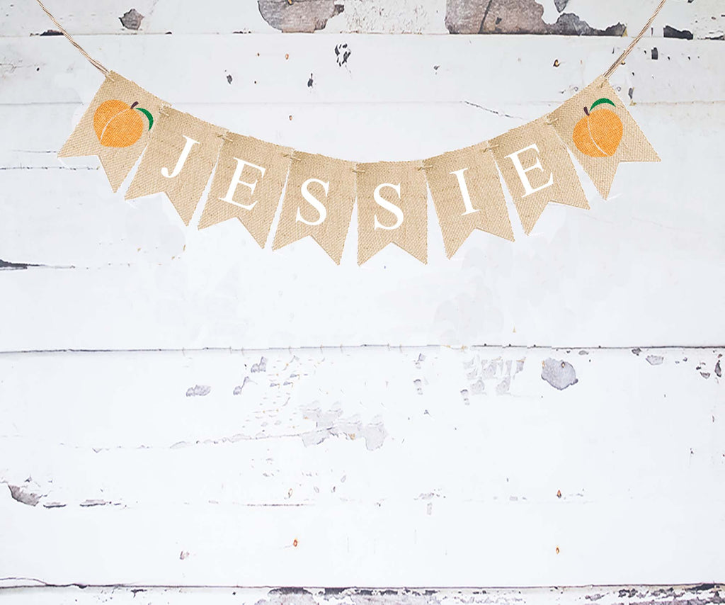 Peach fruit party decor, Floral Birthday Party Decoration. Personalize this peach themed party banner with the name of your choice! Adorable peaches are hand painted onto burlap flags with bright white lettering.