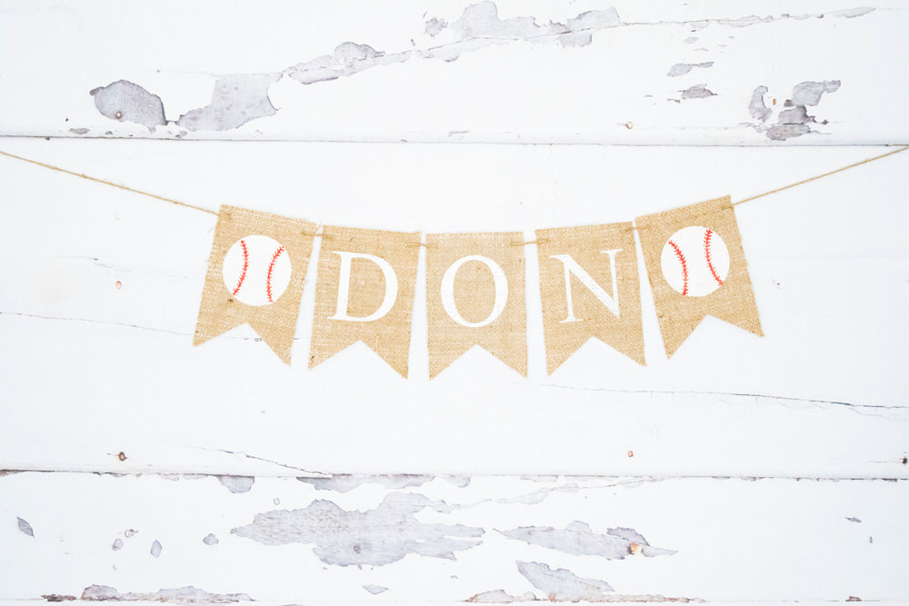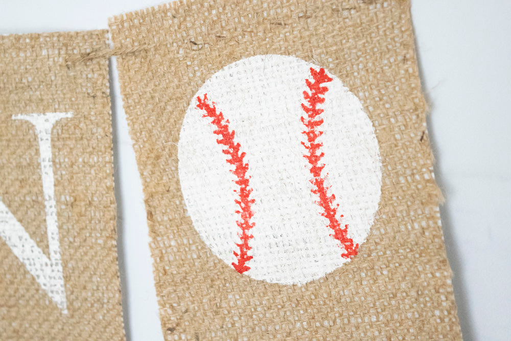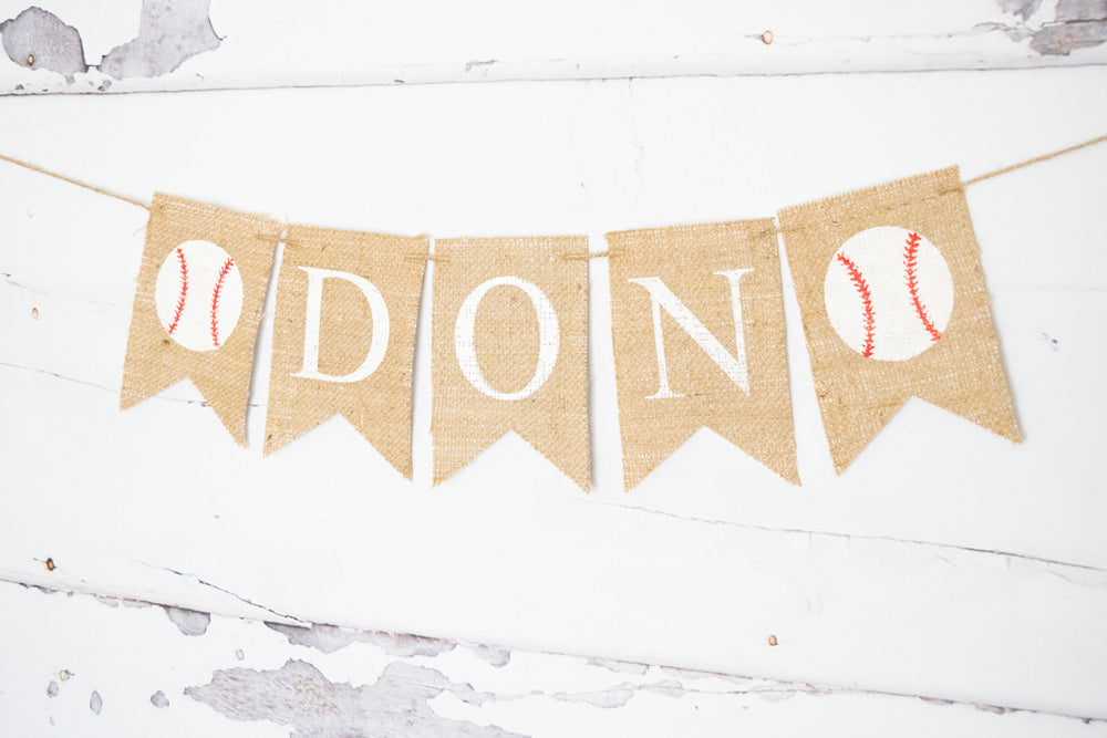A baseball themed banner perfect for your child's room, a baby shower, or at a birthday party, the uses are endless. A bright white baseball and the wording of your choice are painted on burlap for a rustic look.