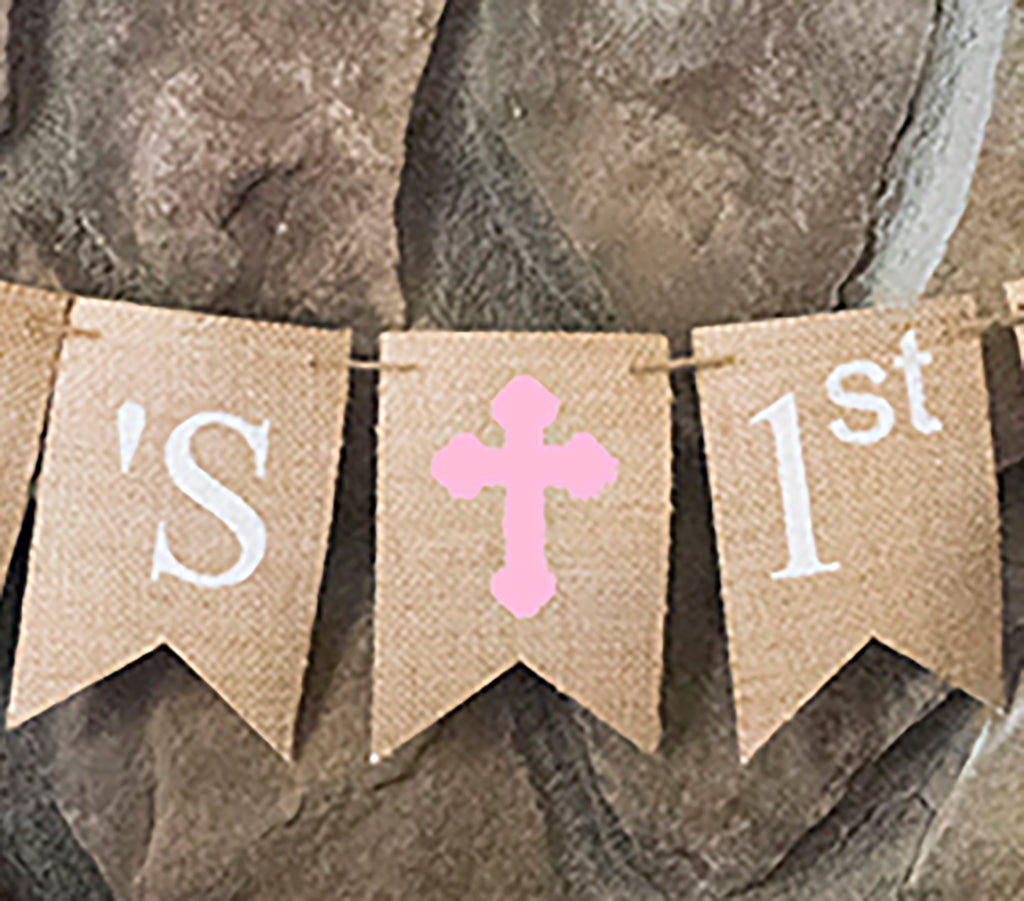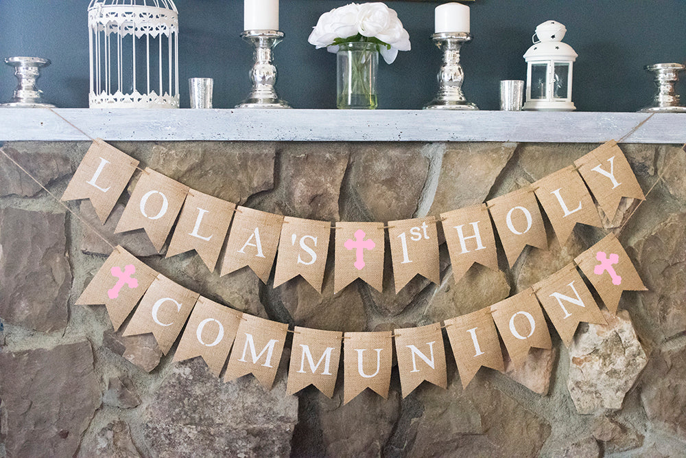 Communion decoration, 1st holy communion banner. Perfect for a first communion celebration, with white letters and pink crosses you can personalize this banner with the name of your choice. Just use the drop-down menu on the right to select the number of letters you will need for the name only.