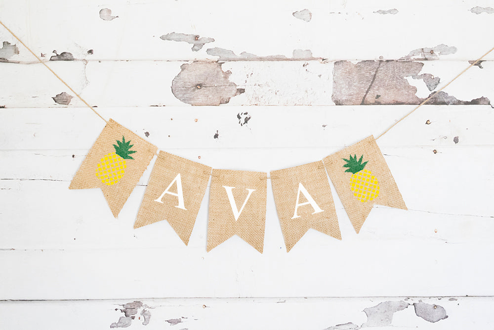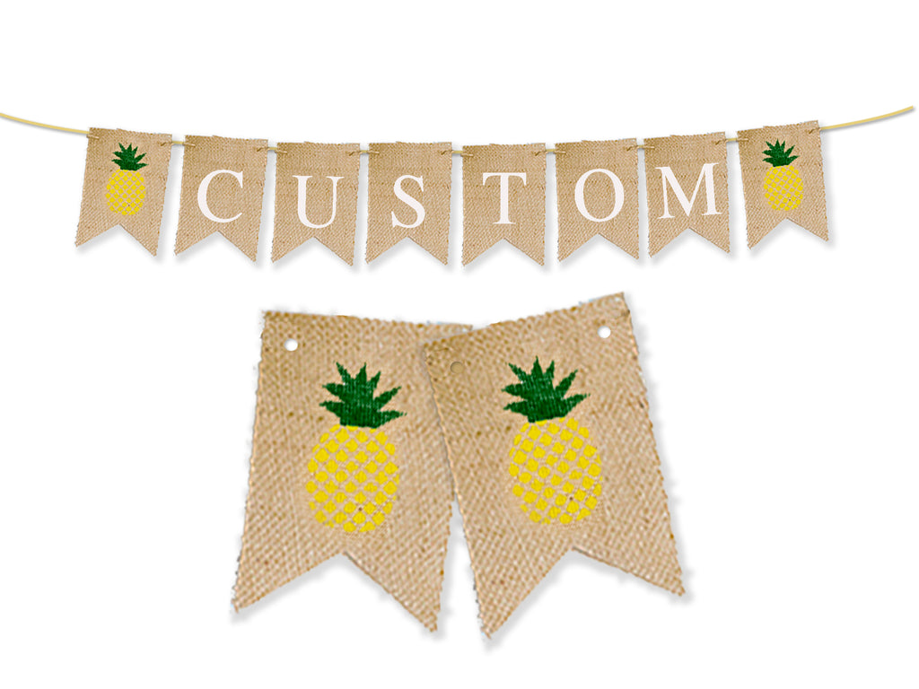 Pineapple Banner. This is an absolutely gorgeous pineapple banner, perfect for your summer party decor. Bright yellow and green pineapples around the custom wording of your choice in white capital letters.