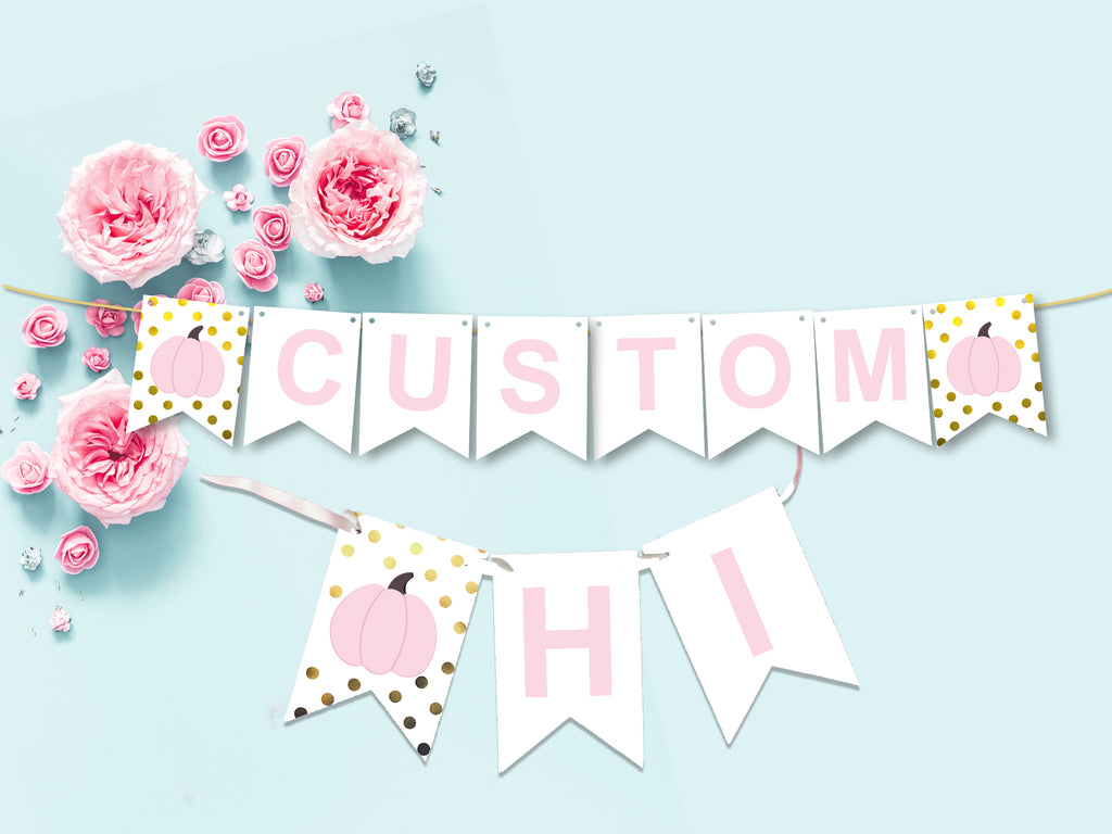 Fall Party Decorations, A Pink and gold printed Pumpkin banner. Perfect for a girls' fall birthday party featuring gorgeous pumpkins in pink on a printed gold polka dot flag. This banner will include the wording of your choice. Use it to happy birthday or as part of your fall themed home decor. Include your custom wording below. Count out the letters in your wording then select from the drop down menu. Do not include the pumpkins.