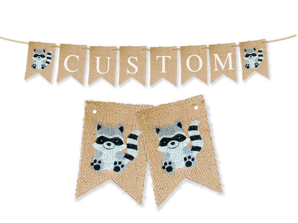 Woodland Banner. This is an absolutely gorgeous raccoon banner, perfect for your woodland party decor. Letters are painted in white capitals.