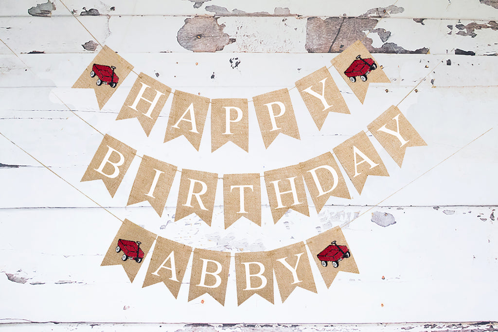 Red wagon party decor. A red wagon decoration for a wagon-themed Birthday Party. This plane birthday banner features wagons painted in red with the words Happy Birthday in between. Personalize this banner with the name of your choice. Just use the drop-down menu on the right to select the number of letters you will need for the name only.