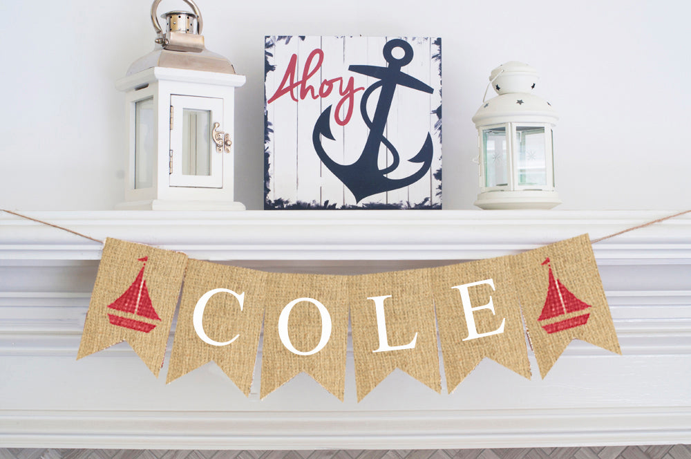 Nautical Party Decor. A Nautical-themed banner, personalize with your own custom wording. Bright red boats with white lettering in the name of your choice! Great for a nautical-themed room or party!