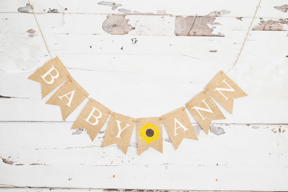 Sunflower baby reveal decor. Perfect for a summer baby shower or a sunflower nursery. Personalize this banner with the name of your choice. Just use the drop-down menu on the right to select the number of letters you will need for the name only.