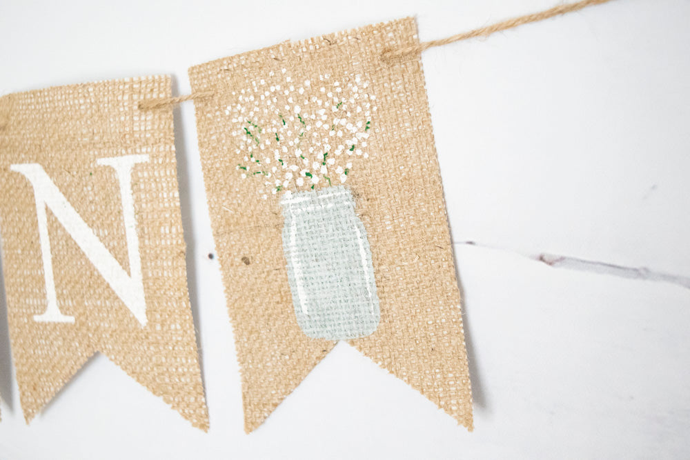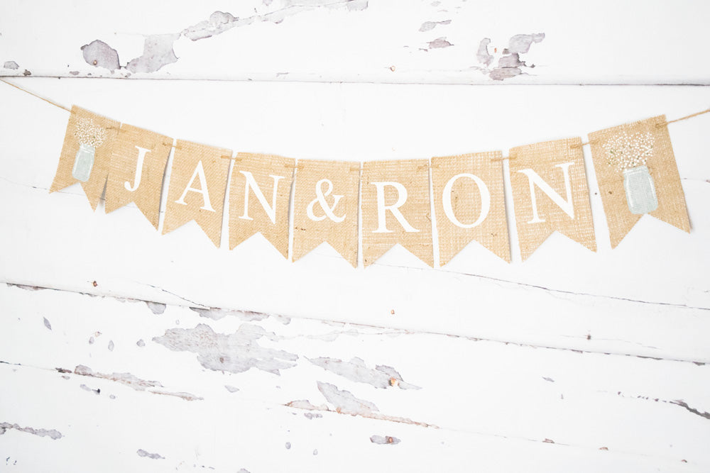 Mason jar wedding decoration. Rustic Wedding Banner. A gorgeous mason jar wedding banner that is perfect for a summer rustic wedding. Hand-painted mason jars are stenciled on burlap and you can personalize this banner with the names of your choice. Just use the drop-down menu on the right to select the number of letters you will need for the names only.