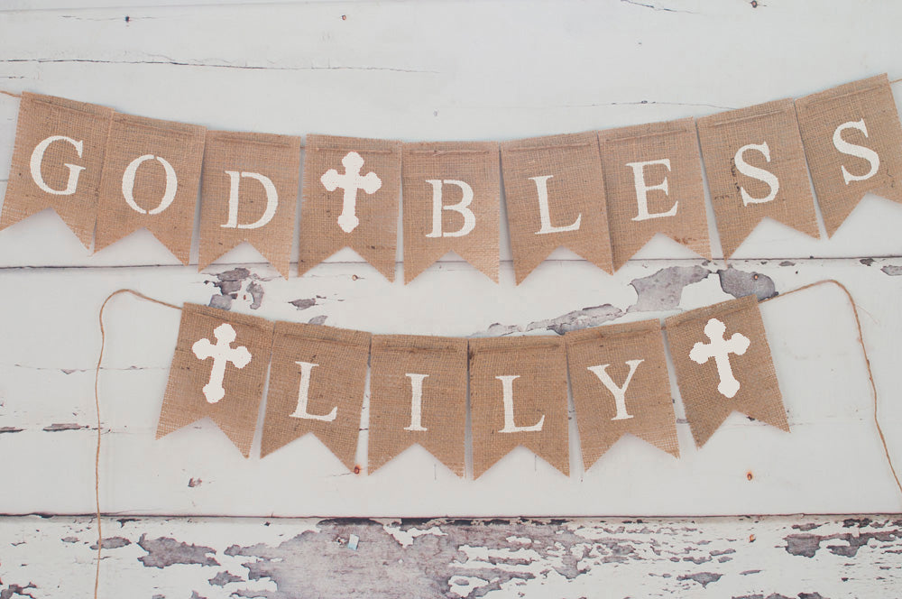 Baptism decoration or first communion decor. This God Bless banner is perfect for a Baptism, First Holy Communion, or Confirmation or hang in a baby's room, the options are endless. God Bless, white crosses, and your choice of name.