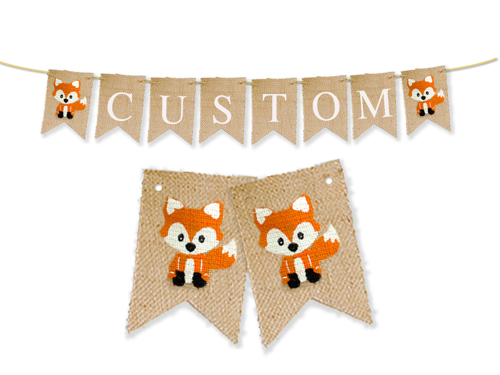Woodland Party Decoration. A woodland-themed Baby Shower decoration, perfect for your Baby's Nursery or at a Birthday Party, the uses are endless. A cute woodland, fox is painted on burlap for that rustic look.