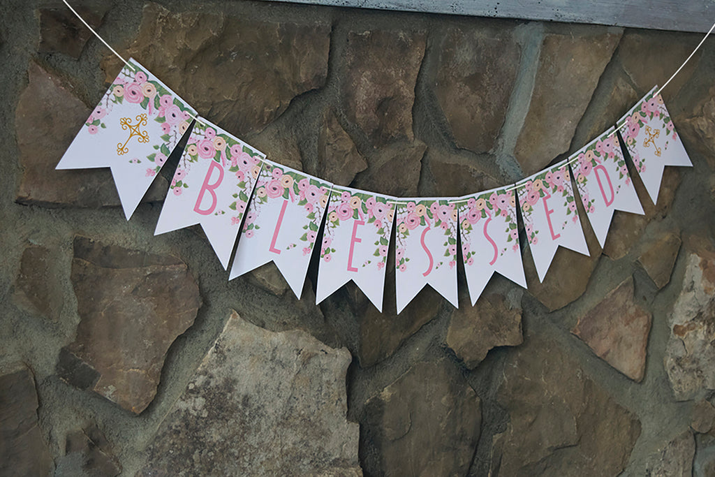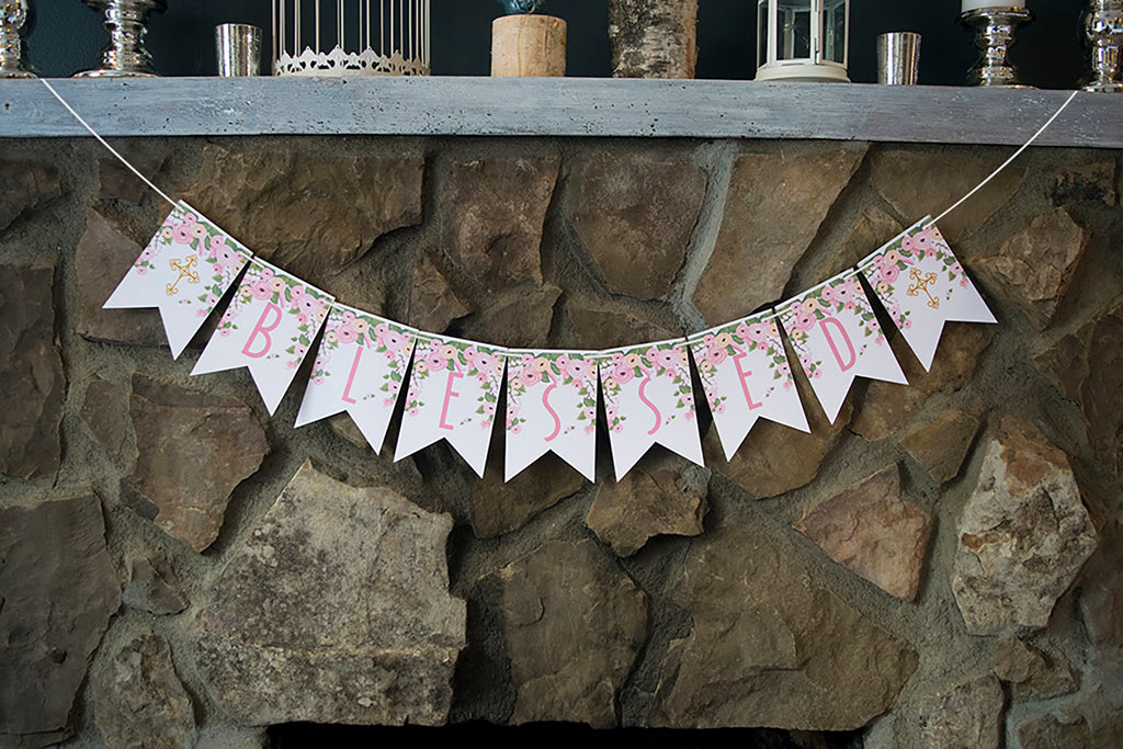 If you're hosting a Confirmation or Holy Communion party for a girl this BLESSED banner that features beautiful, pink floral decor, two golden crosses, and the word "BLESSED" makes a great statement piece