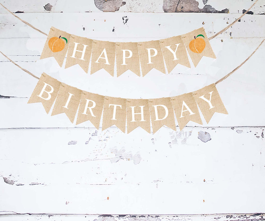 Check out this adorable peach happy birthday banner! Perfect for a fruit themed birthday party. Our bright white letters are accented with beautiful juicy peaches on burlap for a rustic look.
