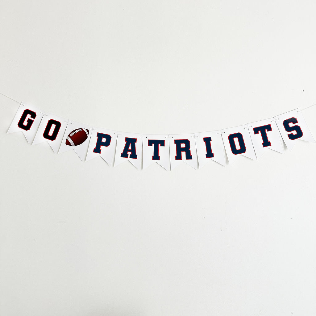 Football Party Decor. It's Game Day, score a touchdown with this Go Patriots football banner, perfect for your football party. You invite the guests and we'll make the decorations. This cardstock banner with the Patriots colors makes the perfect football decor.