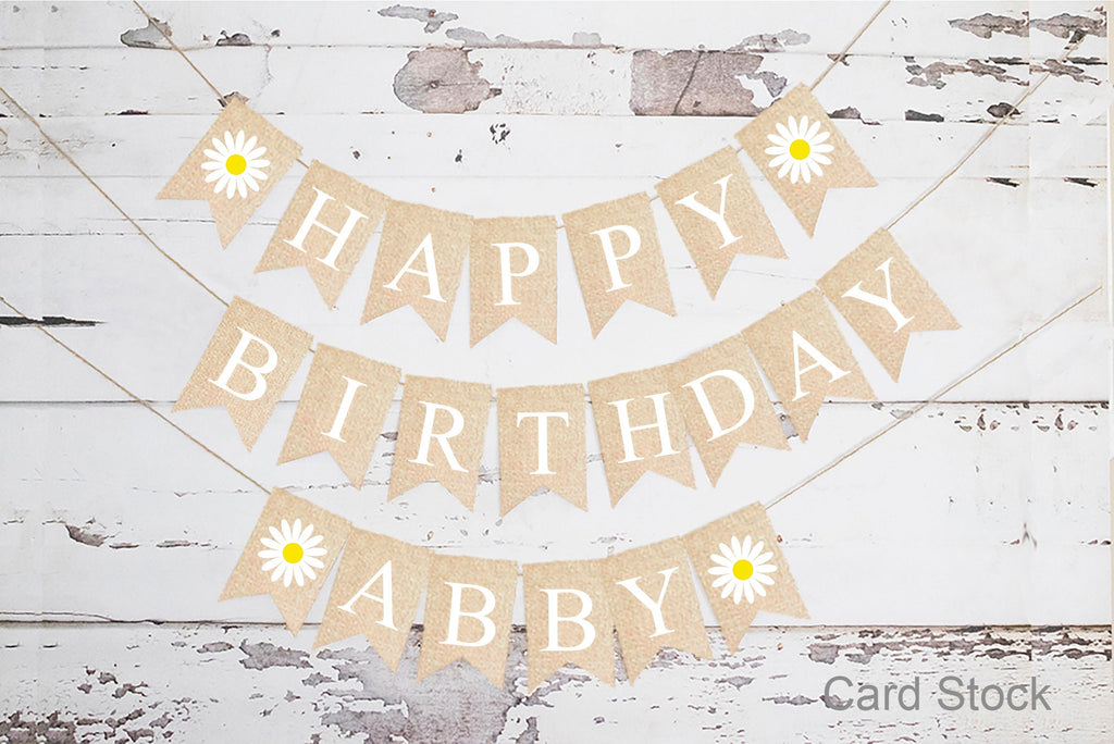 Personalized Daisy Birthday Decor. Check out this adorable happy birthday banner. Bright white lettering paired with white and yellow daisies sure to compliment your summer birthday party decorations. Personalize this banner with the name of your choice. Just use the drop down menu on the right to select the number of letters you will need for the name only.