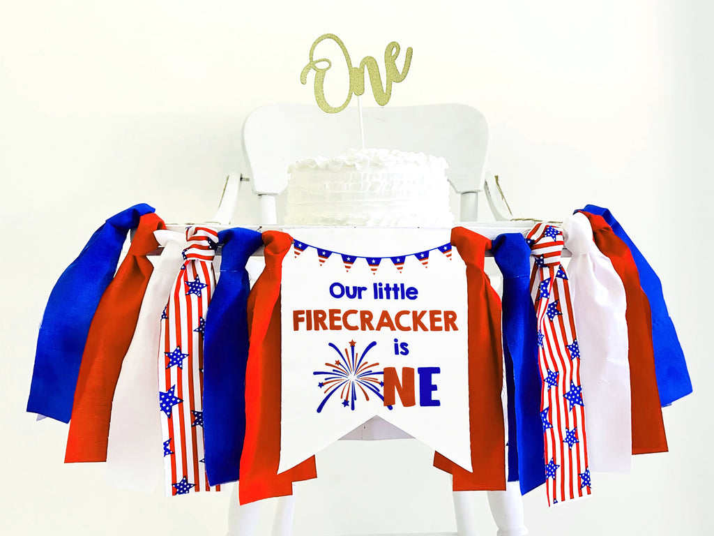 FINAL SALE! A 4th of July themed 1st Birthday Decoration. This stunning First Birthday banner has a vibrant red & blue firework to replace the O in one & wording celebrating your little firecracker turning one! Adorable fabric strips in red, white, & blue make this the perfect summer birthday party banner. Great for a cake smash or July 4th photoshoot prop.