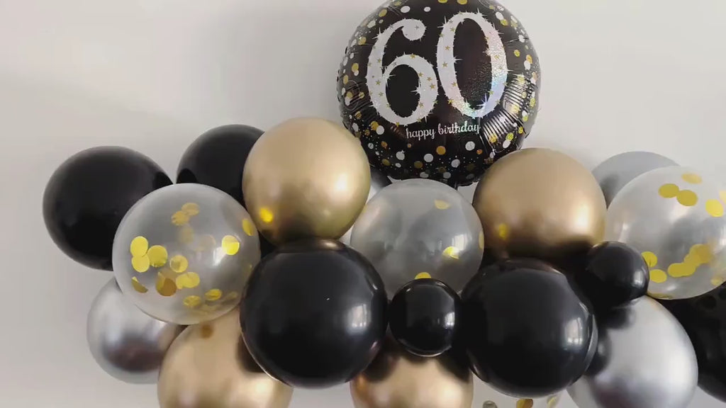 Celebrate 60 with this black, silver & gold balloon collection. This party kit is the perfect backdrop for a milestone birthday celebration. This 60th Birthday Party kit is perfect for that special celebration. See what's included below.