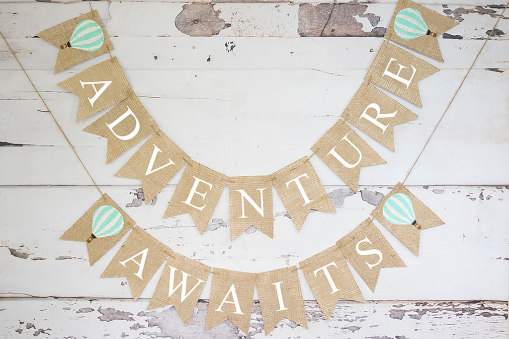 Hot Air Balloon birthday party decor. Celebrate the beginnings of a new Adventure, this banner with the wording Adventure Awaits is perfect for a travel-themed baby shower, a travel party or Adventure themed nursery.